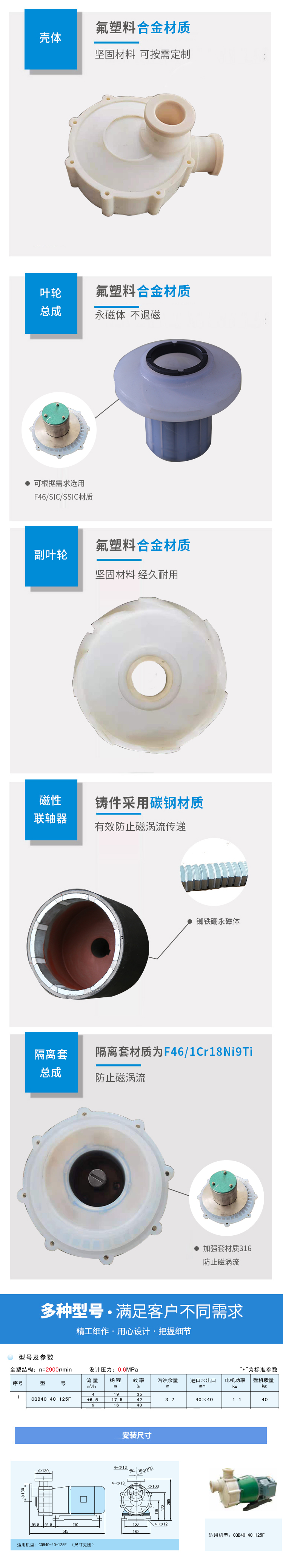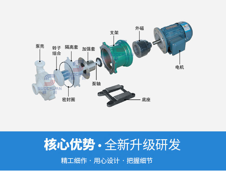 防漏設計取消了軸封,利用磁力耦合間接驅動,消除了滴漏的煩惱,不污染場地。由于泵的過流部分選用“氟塑料合金”制造??蛇B續輸送任意濃度的酸、堿、強氧化劑等腐蝕介質而不受損。