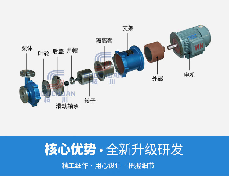 CQ型不銹鋼磁力泵系列產品具有設計合理、全密封、無泄漏、耐腐蝕等特點。在外觀方面不銹鋼磁力泵是遙遙先進的,外觀美觀是它的一大特點,而且結構緊湊,體積小,使用維修方便。在化工、制藥、石油、電鍍、食品、電影照片打印、科研機構、國防工業等單位廣泛應用于酸、堿液、稀有貴重液、毒液、揮發性液體、循環水設備配套、過濾機配套。特別是泄漏、易燃、易爆液體的萃取,更優選選擇該泵。