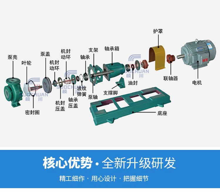 泵體和泵蓋均采用金屬(HT200)基體內襯氟塑料,葉輪采用金屬嵌件(WCB)外包氟塑料合金壓制成型。優點:耐腐蝕性范圍廣,強度高,經久耐用。